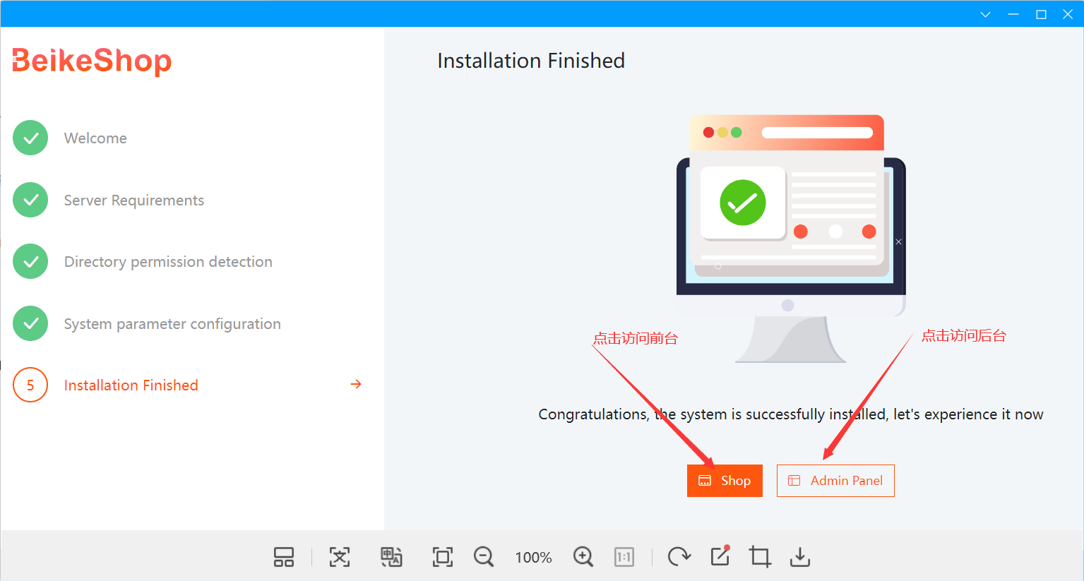浏览器输入域名 beike.shop.test地址,出现如图所示界面则成功进入安装页面。