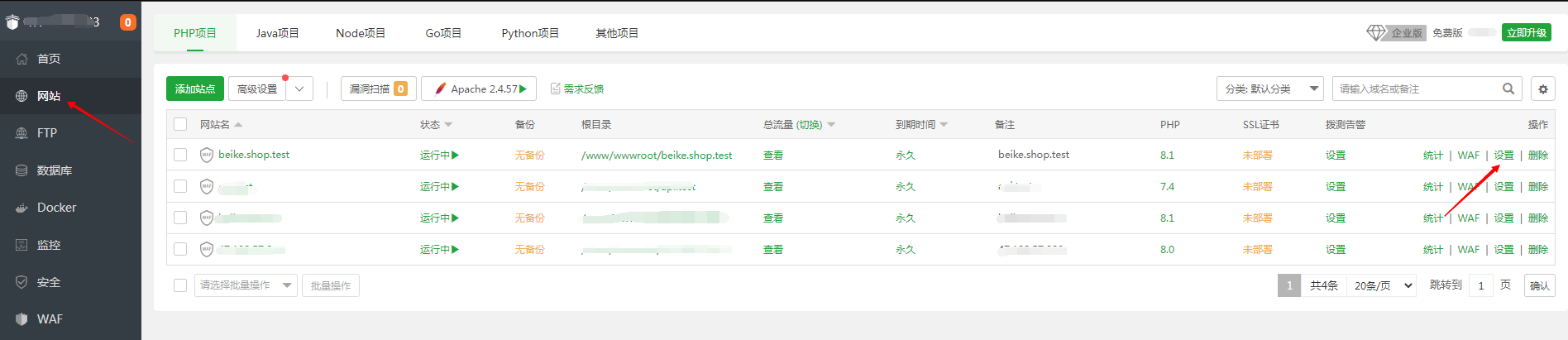 宝塔面板点击网站菜单->找到创建的网站站点并点击设置按钮。如下图所示: